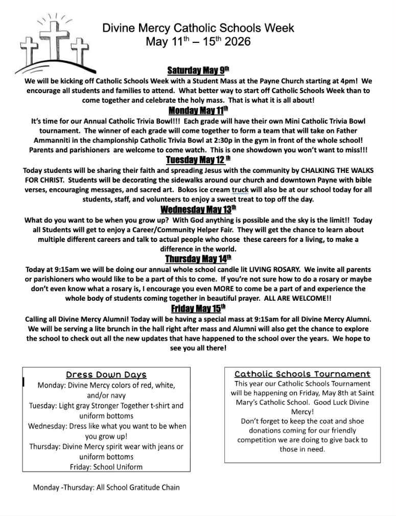 Although Catholic Schools week is celebrated nationally at the end of January to coincide with the feast of St. Thomas Aquinas, at Divine Mercy we hold off on our big celebrations until the weather is better! We are excited to celebrate Catholic Schools in general and our Catholic School in particular during the week of May 11 – May 15!