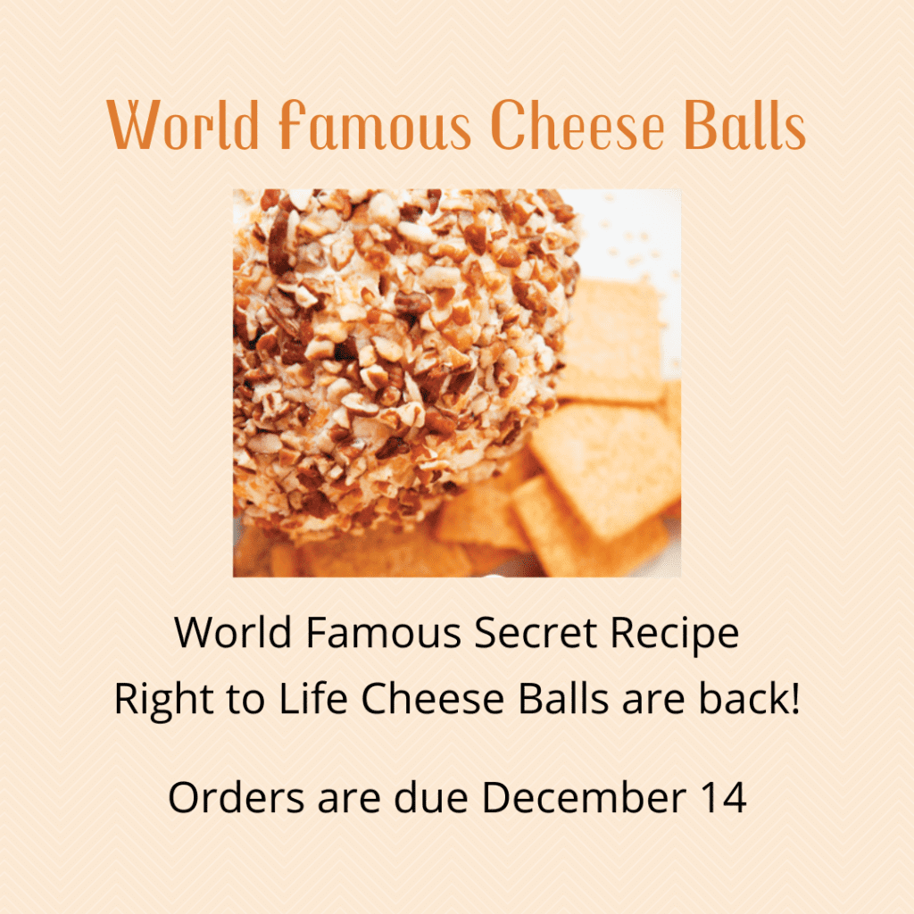 They’re back!!!! It’s time to get your orders in for those *World Famous Right-to-Life Cheese Balls*! Order forms can be found in the pews, in the Narthex at Paulding, and in the back of church at Payne. Price is $5.00 each. All orders are due no later than Sunday, December 14th. Pick up will be after the Masses on the weekend of December 20 and 21.